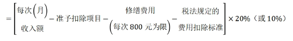 稅法規(guī)定的費(fèi)用扣除標(biāo)準(zhǔn) | ①每次收入≤4000元,定額減除800元 ②每次收入>4000元,定率扣減20% |