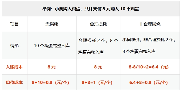 [釋義:對(duì)于合理?yè)p耗,不會(huì)影響其入賬成本(總價(jià)),但會(huì)影響其單位成本(單價(jià))。]