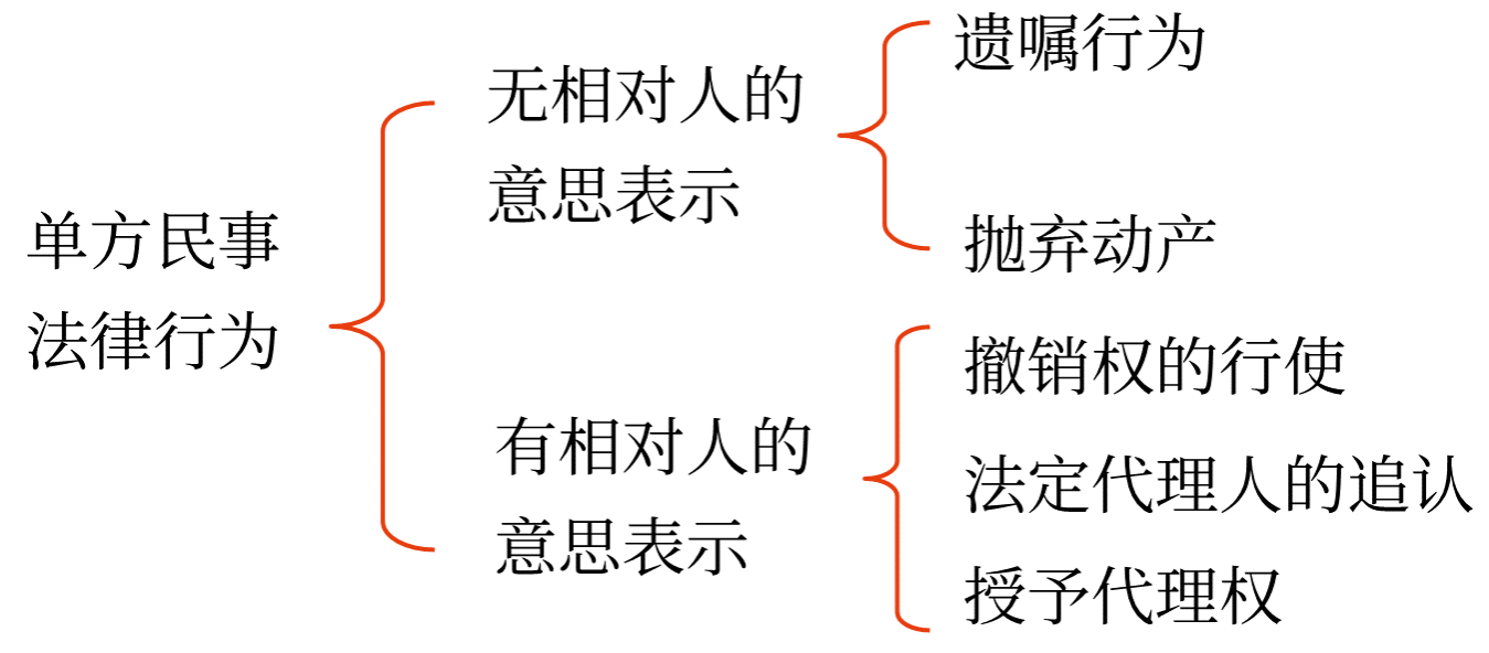 遺囑行為、拋棄動(dòng)產(chǎn)等單方民事法律行為,屬于無相對(duì)人的意思表示。值得注意的是,并非所有的單方民事法律行為都屬于無相對(duì)人的意思表示,如撤銷權(quán)的行使、授予代理權(quán)、法定代理人的追認(rèn)等單方民事法律行為,屬于有相對(duì)人的意思表示。