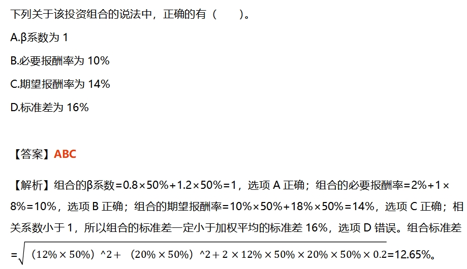 【答案】R必=Rf+β×(Rm-Rf)=4%+2×(10%-4%)=16%。
