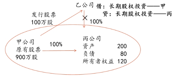 上圖中,甲公司發(fā)行股票100萬股,取得乙公司持有丙公司100%股權(quán),站在乙公司角度體現(xiàn)的是股權(quán)換股權(quán)。甲公司和丙公司要編制合并財務(wù)報表,在合并報表中,甲公司并未流出資產(chǎn),也未承擔(dān)乙公司原債務(wù),因此有觀點認(rèn)為,在合并財務(wù)報表中被合并方的資產(chǎn)和負(fù)債可以按賬面價值入賬。合并方的長期股權(quán)投資代表的是被合并方的凈資產(chǎn)或凈資產(chǎn)的份額,所以同一控制下企業(yè)合并形成的長期股權(quán)投資按被合并方凈資產(chǎn)賬面價值份額入賬。