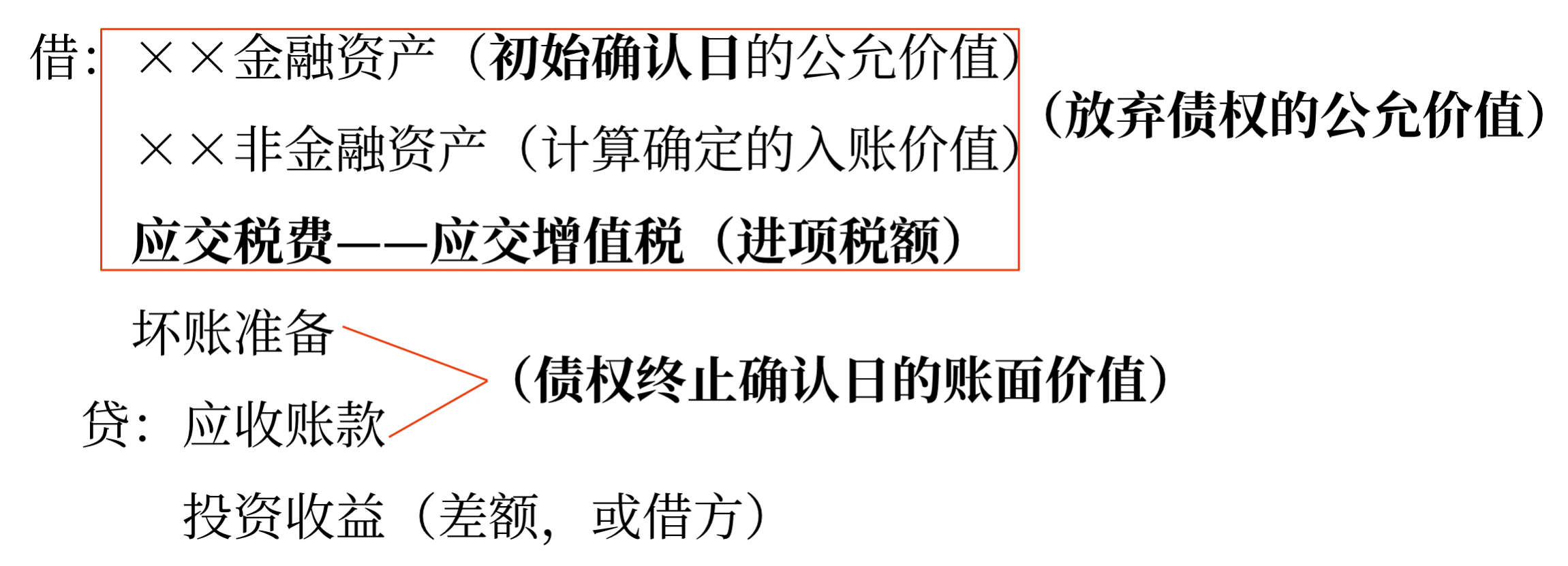 (2)受讓非金融資產(chǎn)入賬價(jià)值的確定(A+B) | 按照受讓的金融資產(chǎn)以外的各項(xiàng)資產(chǎn)在債務(wù)重組合同生效日的公允價(jià)值比例,對(duì)放棄債權(quán)在合同生效日的公允價(jià)值扣除受讓金融資產(chǎn)合同生效日公允價(jià)值后的凈額進(jìn)行分配,并以此為基礎(chǔ)分別確定各項(xiàng)資產(chǎn)的成本。 ①受讓的多項(xiàng)非金融資產(chǎn)入賬價(jià)值總額 =放棄債權(quán)合同生效日的公允價(jià)值 -受讓的金融資產(chǎn)合同生效日的公允價(jià)值 -受讓資產(chǎn)準(zhǔn)予抵扣的增值稅進(jìn)項(xiàng)稅額★★★