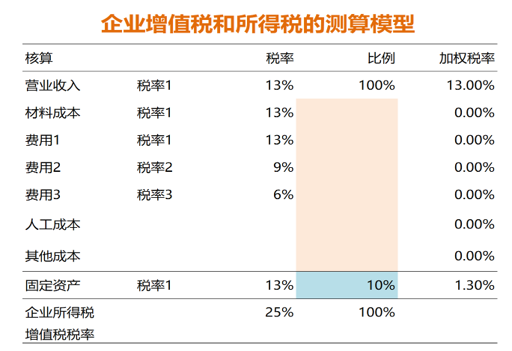 加權稅率 =(增值稅稅率 × 增值稅權重) +(企業(yè)所得稅稅率 × 企業(yè)所得稅權重)