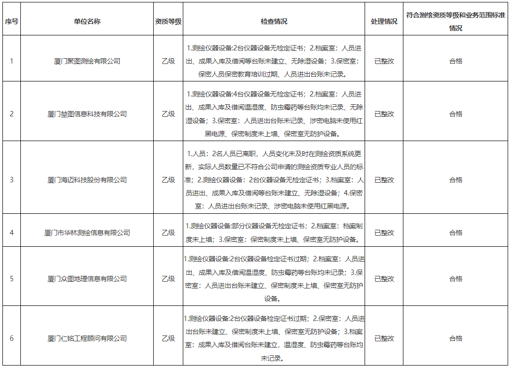 2025年下半年測繪資質(zhì)檢查情況匯總表