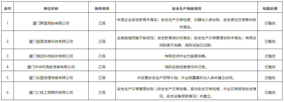 2025年下半年測繪資質(zhì)單位安全生產(chǎn)抽查情況匯總表