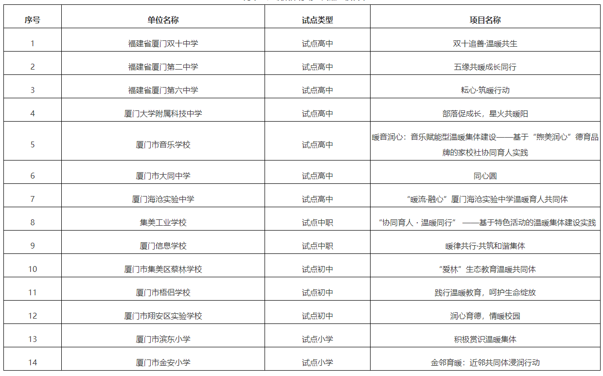 廈門市“溫暖集體行動(dòng)”試點(diǎn)學(xué)校名單