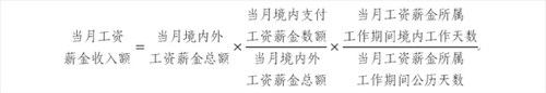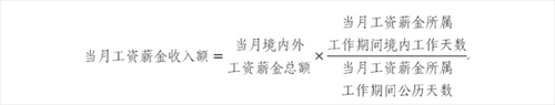 在一個納稅年度內(nèi),在境內(nèi)累計居住超過90天但不滿183天的非居民個人,取得歸屬于境內(nèi)工作期間的工資薪金所得,均應(yīng)當(dāng)計算繳納個人所得稅;其取得歸屬于境外工作期間的工資薪金所得,不征收個人所得稅。當(dāng)月工資薪金收入額的計算公式如下(公式二):