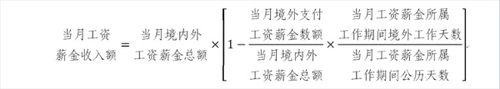 在一個納稅年度內(nèi),在境內(nèi)累計居住不超過90天的非居民個人,僅就歸屬于境內(nèi)工作期間并由境內(nèi)雇主支付或者負(fù)擔(dān)的工資薪金所得計算繳納個人所得稅。當(dāng)月工資薪金收入額的計算公式如下(公式一):