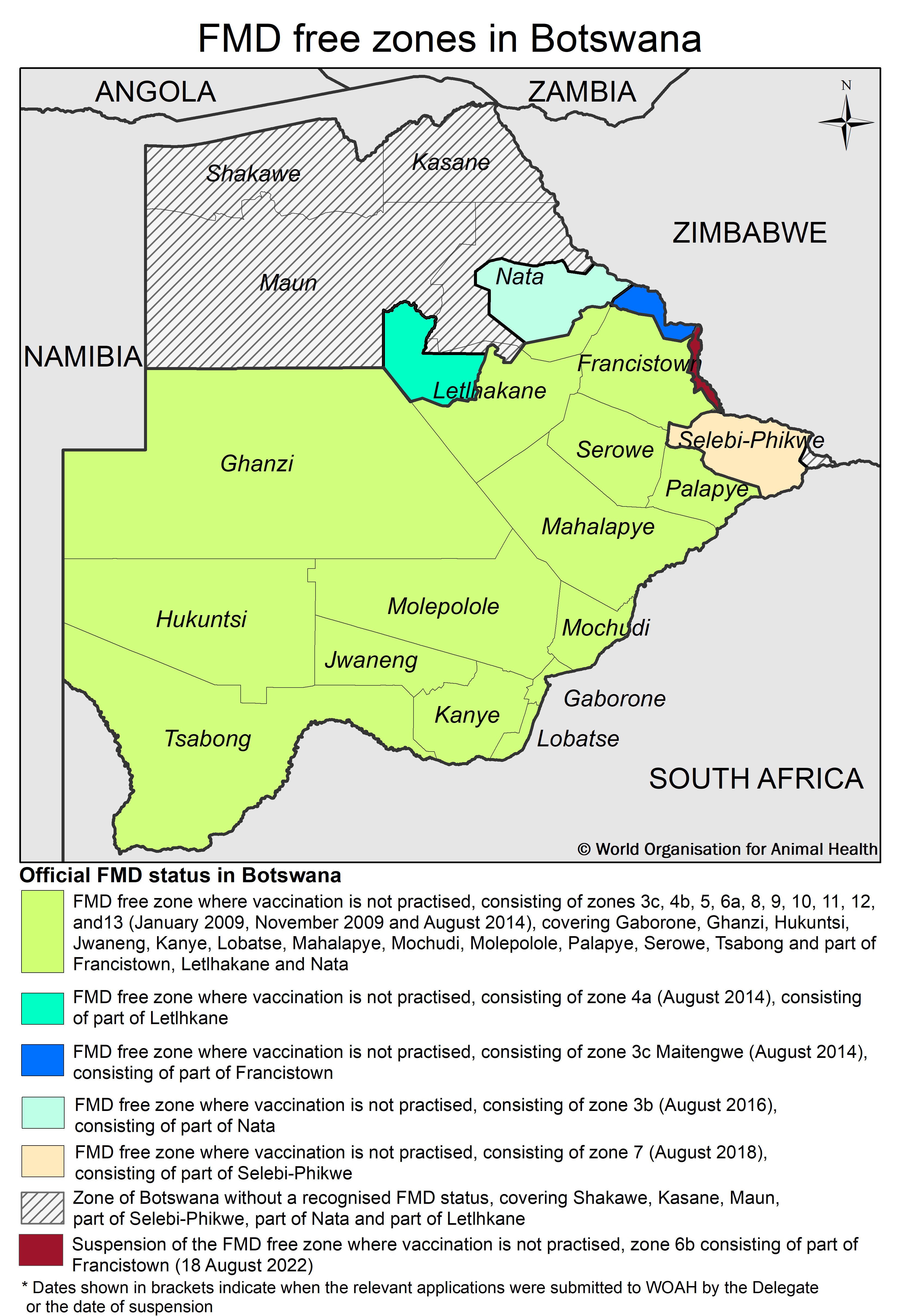 據世界動物衛(wèi)生組織(WOAH)通報,2022年8月18日,博茨瓦納東北區(qū)(North-East)1個村莊發(fā)生口蹄疫,疫點位于我國此前認可的博茨瓦納口蹄疫非免疫無疫區(qū)內。為保護我國畜牧業(yè)安全,防止疫情傳入,根據《中華人民共和國海關法》、《中華人民共和國進出境動植物檢疫法》及其實施條例等有關法律法規(guī)的規(guī)定,決定取消博茨瓦納疫點所在區(qū)域(編號6b,區(qū)劃圖見附件)的口蹄疫非免疫無疫區(qū)地位,禁止上述區(qū)域內偶蹄動物及其產品輸華。