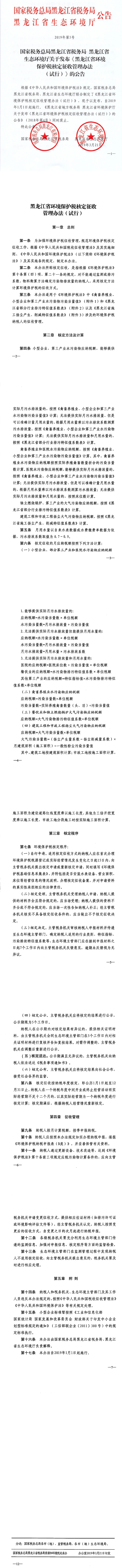 本公告自2019年1月1日起施行,《黑龍江省地方稅務(wù)局 黑龍江省環(huán)境保護(hù)廳關(guān)于發(fā)布<黑龍江省環(huán)境保護(hù)稅核定征收管理辦法(試行)>的公告》(2018年第4號)同時廢止。