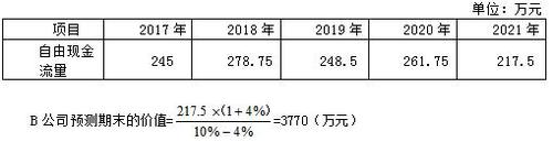 (3)B公司的價(jià)值=245×(P/F,10%,1)+278.75×(P/F,10%,2)+248.5×(P/F,10%,3)+261.75×(P/F,10%,4)+217.5×(P/F,10%,5)+3770×(P/F,10%,5)=245×0.9091+278.75×0.8264+248.5×0.7513+261.75×0.6830+217.5×0.6209+3770×0.6209 =3294.40(萬元)