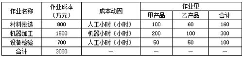 2019年8月,甲、乙兩種產(chǎn)品的產(chǎn)量分別為1000臺和2000臺,單位直接成本分別為1萬元和0.6萬元。此外,甲、乙兩種產(chǎn)品制造費用的作業(yè)成本資料如下表所示: