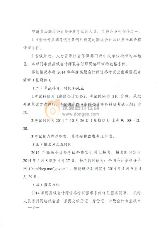 【東奧小編】云南2014年高級會計師考試網(wǎng)上報名時間為4月8日至4月27日,F(xiàn)場確認時間為4月9日至4月29日。