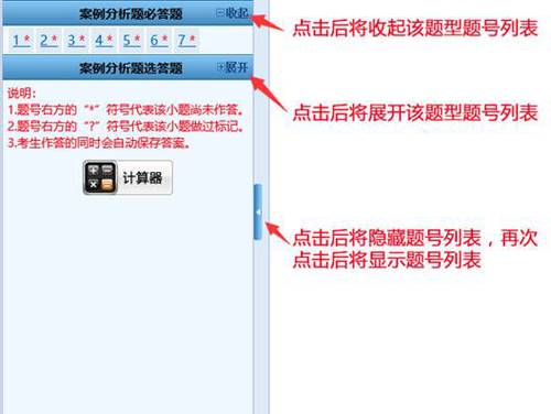 1.題目類型分為案例分析題必答題和案例分析題選答題。題號右方的“*”號表示該小題還未作答,“?”號表示該小題做過標(biāo)記。考生可以通過題號列表查看全套試卷的作答情況(包括每道試題的已答或未答狀態(tài)、標(biāo)記狀態(tài)),還可點(diǎn)擊各題號按鈕,直接進(jìn)入各試題進(jìn)行答題或檢查。