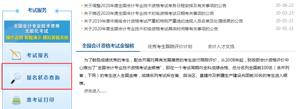 1.登陸全國會計資格評價網(wǎng)http://kzp.mof.gov.cn/,找到報名狀態(tài)查詢版塊
