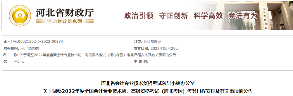 關(guān)于調(diào)整2022年度全國會(huì)計(jì)專業(yè)技術(shù)初、高級(jí)資格考試(河北考區(qū))考務(wù)日程安排及有關(guān)事項(xiàng)的公告