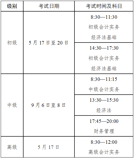 (三)考試時(shí)間及科目初級資格考試于2025年5月17日至20日舉行,考試科目包括《初級會(huì)計(jì)實(shí)務(wù)》、《經(jīng)濟(jì)法基礎(chǔ)》;中級資格考試于9月6日至8日舉行,考試科目包括《中級會(huì)計(jì)實(shí)務(wù)》、《經(jīng)濟(jì)法》、《財(cái)務(wù)管理》;高級資格考試于5月17日舉行,考試科目包括《高級會(huì)計(jì)實(shí)務(wù)》。具體安排如下: