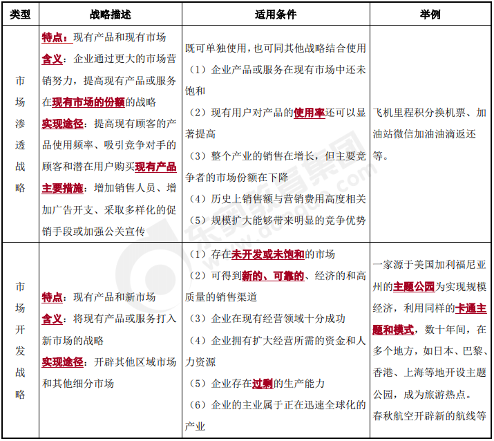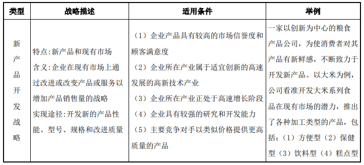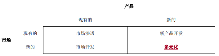 密集型戰(zhàn)略具體類型有:市場滲透、市場開發(fā)、新產(chǎn)品開發(fā)(自己開拓市場、自己創(chuàng)新產(chǎn)品)。 本教材將多元化戰(zhàn)略分為成長型戰(zhàn)略之一。