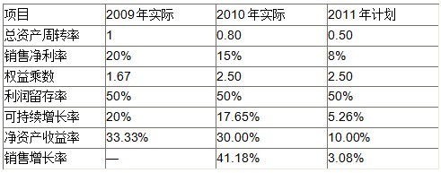 (2)2010年可持續(xù)增長率17.65%與2009年可持續(xù)增長率20%相比,下降了2.35個百分點(diǎn)。其原因是總資產(chǎn)周轉(zhuǎn)率由1次降低為0.8次;銷售凈利率由20%降低為15%。