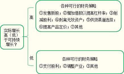 從管理角度,由于企業(yè)增長受限于可持續(xù)增長率,因此當企業(yè)實際增長率超過可持續(xù)增長率時,將面臨資本需要和融資壓力;而當企業(yè)實際增長低于可持續(xù)增長時,表明市場萎縮,企業(yè)應調(diào)整自身經(jīng)營戰(zhàn)略。下圖列出了各種不同情形下的融資規(guī)劃與財務管理策略,它為公司增長管理提供了一個可行的框架。