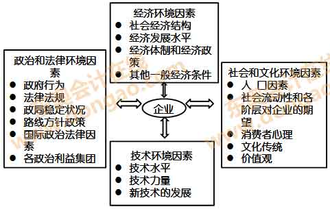 。4)技術(shù)環(huán)境。包括:創(chuàng)新機(jī)制、科技投入、技術(shù)總體水平、技術(shù)開發(fā)應(yīng)用速度及壽命周期、企業(yè)競(jìng)爭(zhēng)對(duì)手的研發(fā)投入,社會(huì)技術(shù)人才的素質(zhì)水平和待遇等。企業(yè)宏觀環(huán)境因素的四個(gè)方面可用圖反映。