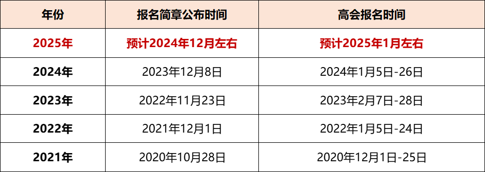 參考過去幾年的數(shù)據(jù)表明,報名簡章的公布時間通常在考試前一年的年底公布,次年初開始報名。為避免錯過報名時間,點擊預約報名提醒,及時通知您>>