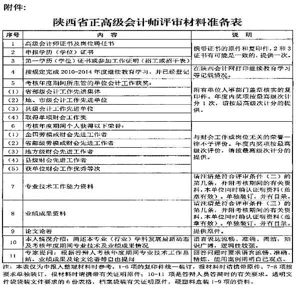 陜西省2015年高級(jí)會(huì)計(jì)師資格評(píng)審材料繼續(xù)實(shí)行網(wǎng)上申報(bào),同時(shí)報(bào)送如下紙質(zhì)材料備查。