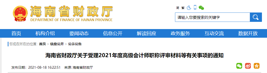 海南省財政廳發(fā)布關(guān)于受理2021年度高級會計師職稱評審材料等有關(guān)事項的通知