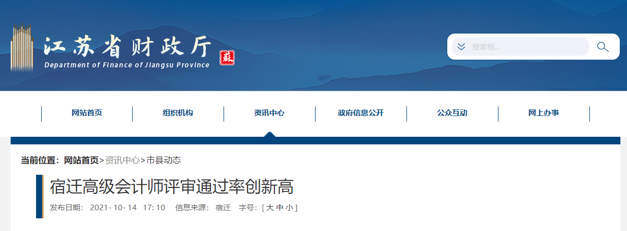 江蘇省財政廳日前公布了2021年全省高級會計師評審?fù)ㄟ^人員名單,宿遷市35名參評人員中有22人通過評審,通過率63%,通過人數(shù)及通過率雙雙創(chuàng)出歷史新高。