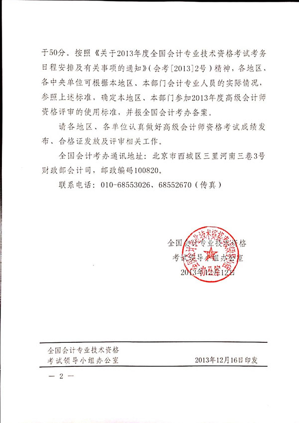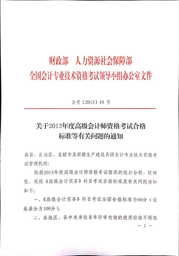 【東奧小編】2013年全國高級會計職稱考試成績合格標準線已經(jīng)正式發(fā)布,合格標準為60分。各地區(qū)、各中央單位當年評審有效的使用標準不得低于50分。官方正式文件:《關于2013年度高級會計師資格考試合格標準等有關問題的通知》。具體內(nèi)容如下: