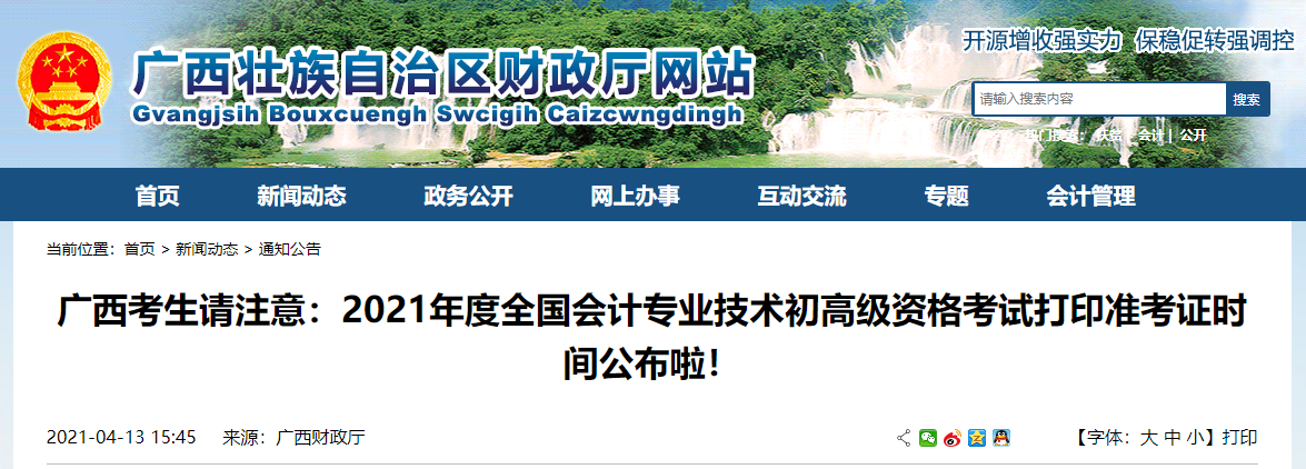 2021年度全國會計專業(yè)技術(shù)初級資格廣西考區(qū)考試時間定于2021年5月15日至5月19日、5月22日至5月23日舉行,高級資格考試定于2021年5月15日上午舉行。請我區(qū)廣大考生及時做好如下考前打印準(zhǔn)考證等準(zhǔn)備事項(xiàng):