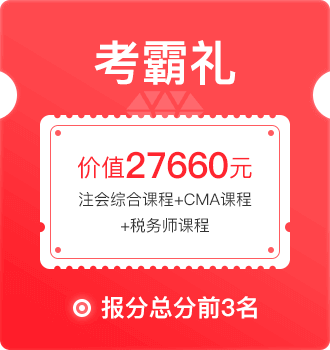 考霸禮:注會綜合階段(5年學(xué)習(xí)期,價值3980元)+CMA(B+C高端總裁班,1年2科,價值:20800元)+稅務(wù)師(A+B+C通關(guān)無憂班,5年5科,價值:2880元)。