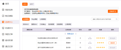 3. 選課流程:由于學員已經(jīng)在吉林會計網(wǎng)交完費,現(xiàn)在直接選課即可。如圖所示:課程后面相應(yīng)會有“請選擇”字樣,選擇的課程若是不想選了,可點擊“取消選擇”字樣。