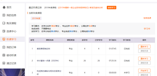4. 聽課流程:選擇左側(cè)導航欄處聽課學習,會出現(xiàn)所選的所有課程,如圖所示:若學員還未開始學習時,課程后面彩色字樣是“開始學習”;若是一節(jié)課程沒學完,會顯示“繼續(xù)學習”字樣;若是一節(jié)課程完全學習完成,相應(yīng)后面會顯示“重新學習”字樣,望學員周知。