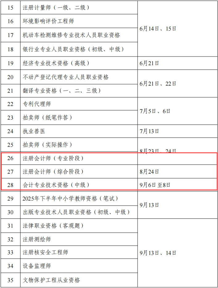 各類行業(yè)競爭越來越卷,壓力越來越大,大家把目光紛紛投入到職稱考試上,力求在翻卷海浪中能順利上岸,有所收獲。有行業(yè)認可的證書加持在身,就能比別人更具有優(yōu)勢和不可替代性,會計行業(yè)亦是如此。人力資源社會保障部辦公廳近日發(fā)布《關(guān)于2025年度專業(yè)技術(shù)人員職業(yè)資格考試工作計劃及有關(guān)事項的通知》身為會計從業(yè)人員,除了需要完成會計繼續(xù)教育,也可以依照此表制定新一年的考試計劃了!