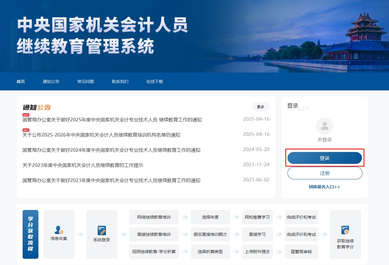 會計(jì)人員可進(jìn)入中央國家機(jī)關(guān)高級會計(jì)人員繼續(xù)教育網(wǎng)站(https://ggjgk.dongao.cn/),點(diǎn)擊“立即登錄”,進(jìn)入中央國家機(jī)關(guān)會計(jì)人員繼續(xù)教育管理系統(tǒng)。