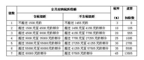 這則消息最受益群體是廣大工薪階層,據(jù)調(diào)查,大部分人的工資現(xiàn)處在6000-10000元之間,但是3500的起征點(diǎn)仍然是六年前的標(biāo)準(zhǔn),本來到手工資就不高,再加上個(gè)稅的扣除,收入更加捉襟見肘。本次個(gè)稅起征點(diǎn)調(diào)高對(duì)于工薪階層來說肯定是利大于弊。我國工資薪金所得稅納稅征收采用的是超額累進(jìn)法,分為七個(gè)等級(jí),稅率為3%~45%,工資越高,征收的個(gè)稅越高。詳情見下圖: