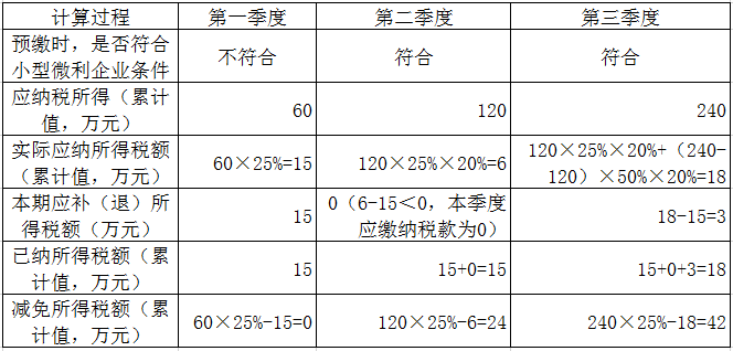 小李的公司第一季度不符合小型微利企業(yè)條件,且應(yīng)該納稅所得額為60萬元;第二季度符合小型微利企業(yè)條件,應(yīng)該納稅所得額為120萬元;第三季度符合小型微利企業(yè)條件,應(yīng)該納稅所得額為240萬元。則,小李公司三個季度企業(yè)所得稅應(yīng)納稅額如下: