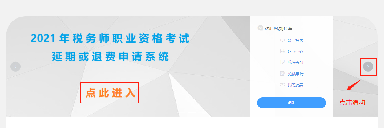 點(diǎn)擊下圖所示位置,可滑動(dòng)輪播圖,而后點(diǎn)擊“點(diǎn)擊進(jìn)入”按鈕,進(jìn)入延考或退費(fèi)申請(qǐng)系統(tǒng)