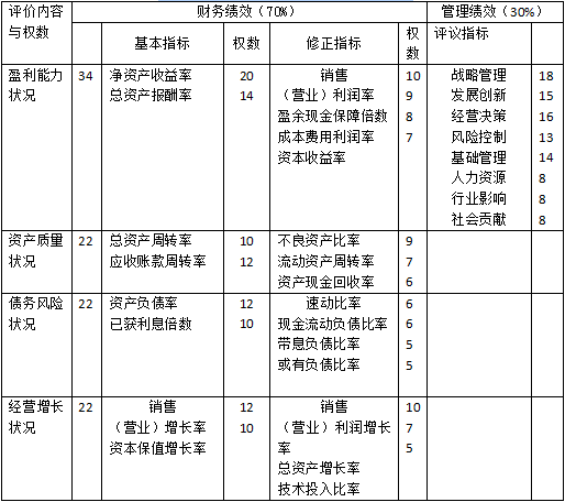 企業(yè)綜合績(jī)效評(píng)價(jià)標(biāo)準(zhǔn)分為財(cái)務(wù)績(jī)效定量評(píng)價(jià)標(biāo)準(zhǔn)和管理績(jī)效定性評(píng)價(jià)標(biāo)準(zhǔn):財(cái)務(wù) 績(jī)效定量評(píng)價(jià)標(biāo)準(zhǔn)包括國(guó)內(nèi)行業(yè)標(biāo)準(zhǔn)和國(guó)際行業(yè)標(biāo)準(zhǔn)。其中國(guó)內(nèi)行業(yè)標(biāo)準(zhǔn)根據(jù)國(guó)內(nèi)企業(yè)年度財(cái)務(wù)和經(jīng)營(yíng)管理統(tǒng)計(jì)數(shù)據(jù),運(yùn)用數(shù)理統(tǒng)計(jì)方法,分年度、分行業(yè)、分規(guī)模統(tǒng)一測(cè)算并發(fā)布國(guó)際行業(yè)標(biāo)準(zhǔn)根據(jù)居于行業(yè)國(guó)際領(lǐng)先地位的大型企業(yè)相關(guān)財(cái)務(wù)指標(biāo)實(shí)際值,或者根據(jù)同類型企業(yè)組相關(guān)財(cái)務(wù)指標(biāo)的先進(jìn)值,在剔除會(huì)計(jì)核算差異后統(tǒng)一測(cè)算并發(fā)布:財(cái)務(wù)績(jī)效 定量評(píng)價(jià)標(biāo)準(zhǔn)按用不同行業(yè)、不同規(guī)模及指標(biāo)類別,分別測(cè)算出優(yōu)秀值、良好值、平均值、較低值和較差值五個(gè)檔次:企業(yè)綜合績(jī)效評(píng)價(jià)指標(biāo)權(quán)重實(shí)行百分制,指標(biāo)權(quán)重依據(jù)評(píng)價(jià)指標(biāo)的重要性和各指標(biāo)的引導(dǎo)功能通過(guò)征求咨詢專家意見(jiàn)和組織必要的測(cè)試進(jìn)行確定。其中,財(cái)務(wù)績(jī)效定量評(píng)價(jià)指標(biāo)權(quán)重確定為70,管理績(jī)效定性評(píng)價(jià)指標(biāo)權(quán)重確定為30%。在實(shí)際評(píng)價(jià)過(guò)程中,財(cái)務(wù)績(jī)效定量指標(biāo)和管理績(jī)效定性評(píng)價(jià)指標(biāo)的權(quán)數(shù)均按百分制設(shè)定,分別計(jì)算分項(xiàng)指標(biāo)的分值,然后按照70:30折算。各評(píng)價(jià)指標(biāo)權(quán)數(shù)如表2-3所示。