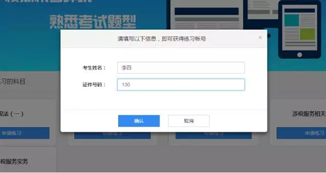 點(diǎn)擊任一科目下的“申請(qǐng)練習(xí)”按鈕,彈出如下提示框,輸入姓名和證件號(hào)碼(提示:不用填真實(shí)的),然后點(diǎn)擊確認(rèn)。