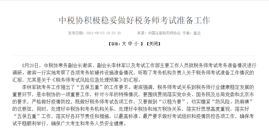 中稅協(xié)對(duì)疫情防控工作一直保持充分的重視,早在8月20日,中稅協(xié)常務(wù)副會(huì)長(zhǎng)謝濱、副會(huì)長(zhǎng)李林軍以及考試工作部主要工作人員就稅務(wù)師考試考務(wù)準(zhǔn)備情況調(diào)研時(shí),就強(qiáng)調(diào)要嚴(yán)格做好疫情防控。
