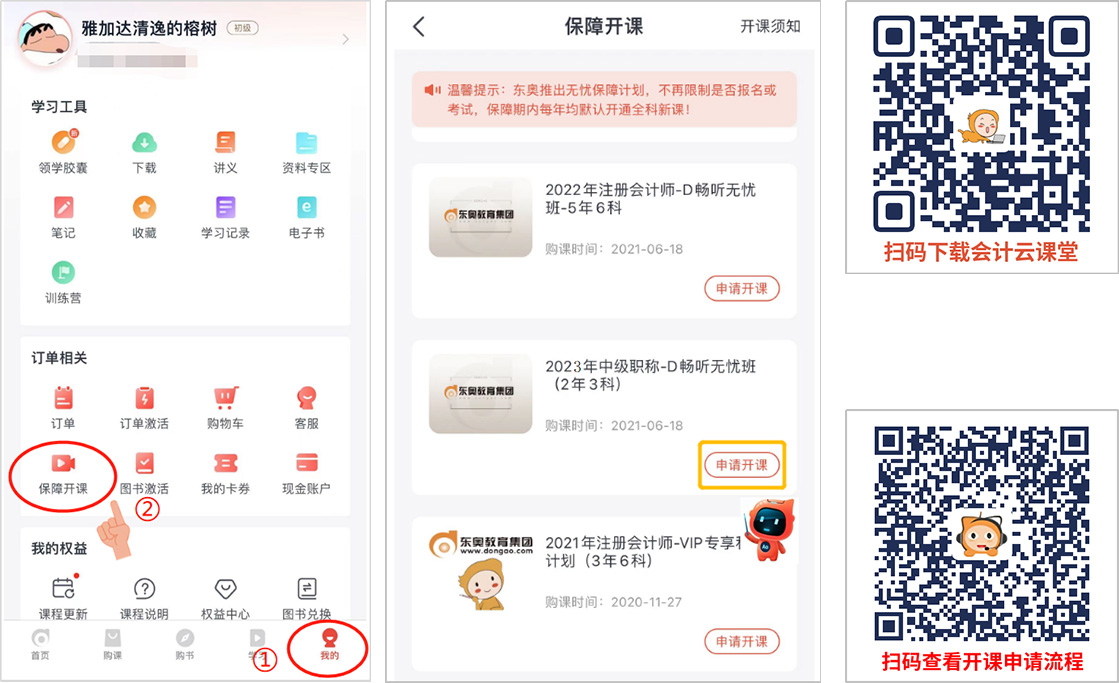 登錄【會計云課堂】→右下角“我的”→“訂單相關(guān)”→“保障開課”→“申請開課”,人臉識別成功后,可開通2024考季課程: