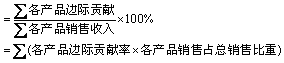 (1)關(guān)系公式:變動成本率+邊際貢獻(xiàn)率=1 (2)多種產(chǎn)品的邊際貢獻(xiàn)率要用加權(quán)平均數(shù),其公式為:
