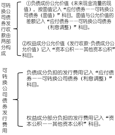 負(fù)債成份面值,貸記“應(yīng)付債券——可轉(zhuǎn)換公司債券(面值)”科目,按權(quán)益成份的公允價(jià)值,貸記“資本公積——其他資本公積”科目,按借貸雙方之間的差額,借記或貸記“應(yīng)付債券——可轉(zhuǎn)換公司債券(利息調(diào)整)”科目。