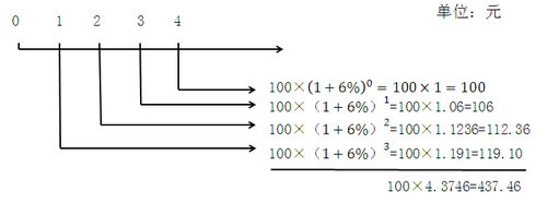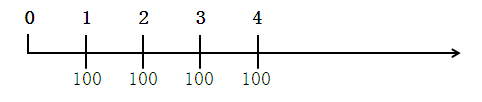 【例題】某投資者在未來4年,每年年末存入銀行100元,銀行年利息率是6%,計算第四年年末的本利和?(時間價值線)