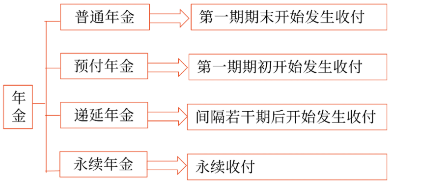 【年金的種類】:普通年金、預付年金、遞延年金、永續(xù)年金。