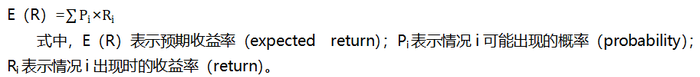 (1)先描述影響收益率的各種可能情況,然后預測各種可能發(fā)生的概率,以及在各種可能情況下收益率的大小,那么預期收益率就是各種情況下收益率的加權平均,權數(shù)是各種可能情況發(fā)生的概率。計算公式為:
