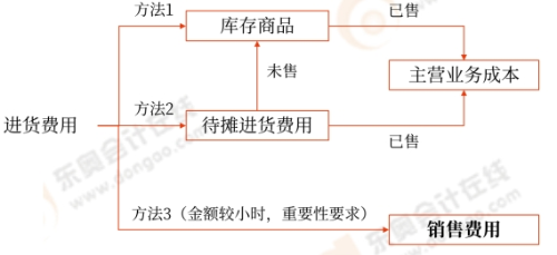 商品流通企業(yè)在采購商品過程中發(fā)生的運(yùn)輸費(fèi)、裝卸費(fèi)、保險(xiǎn)費(fèi)以及其他可歸屬于存貨采購成本的費(fèi)用等(即進(jìn)貨費(fèi)用),有三種處理方法: