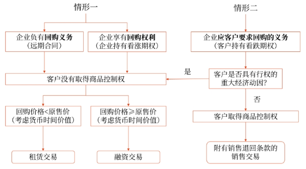 企業(yè)應(yīng)當(dāng)區(qū)分下列兩種情形分別對售后回購交易進(jìn)行會(huì)計(jì)處理。如圖:
